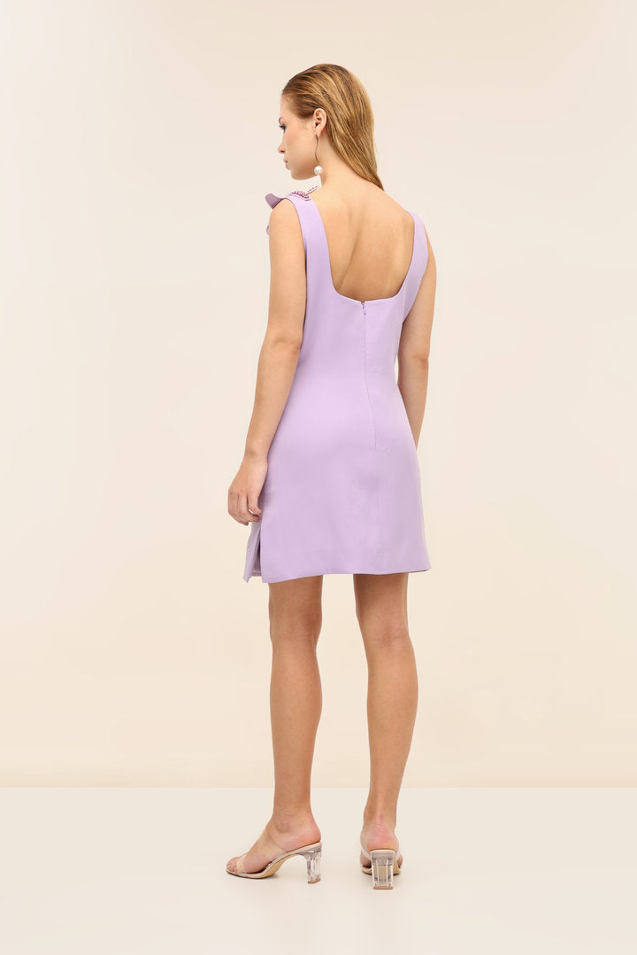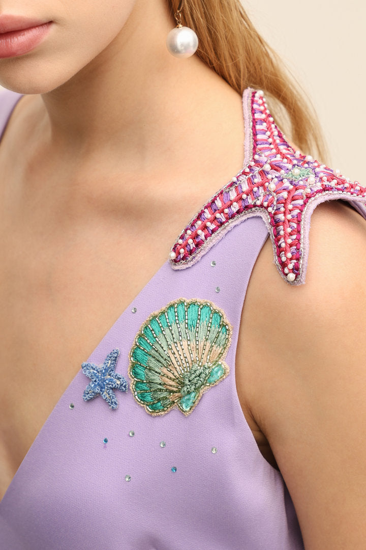 The Elva Mini Dress is a sleek shift silhouette in banana crepe, designed with a flattering V-neckline and wide shoulder straps. Hand-beaded sea-inspired motifs bring texture and whimsy, making this polished mini a standout for seaside dinners and resort nights.