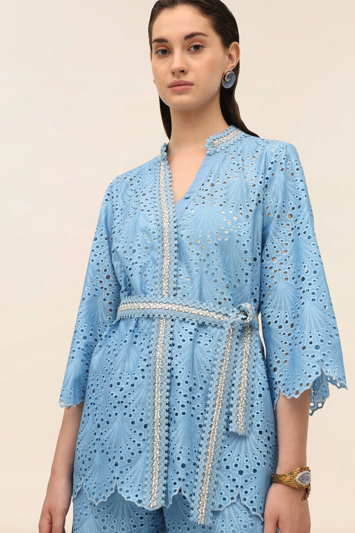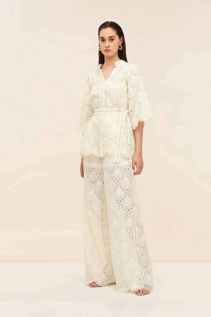 The Ecru Kimono Top features seashell schiffli with scalloped edges, tonal embroidery down the front placket, and an embroidered belt. With a relaxed wrap silhouette and cropped sleeves, it brings a polished softness to your summer set dressing.